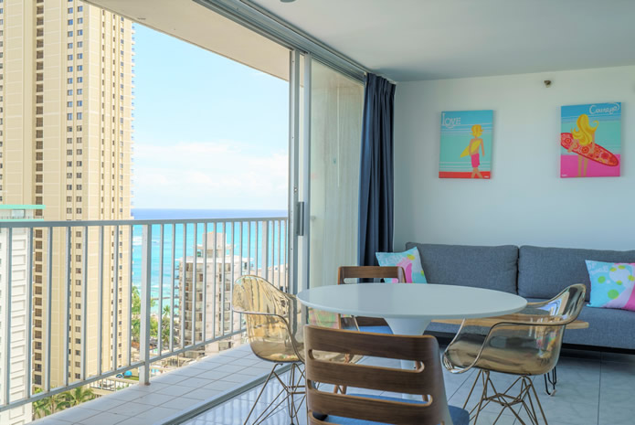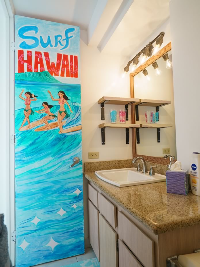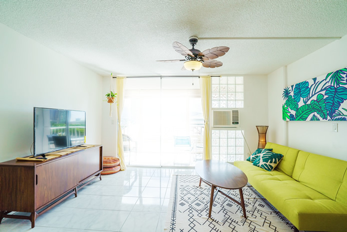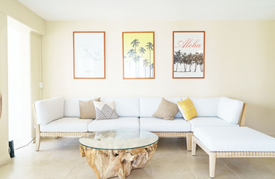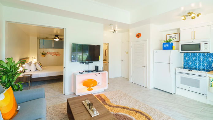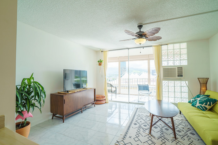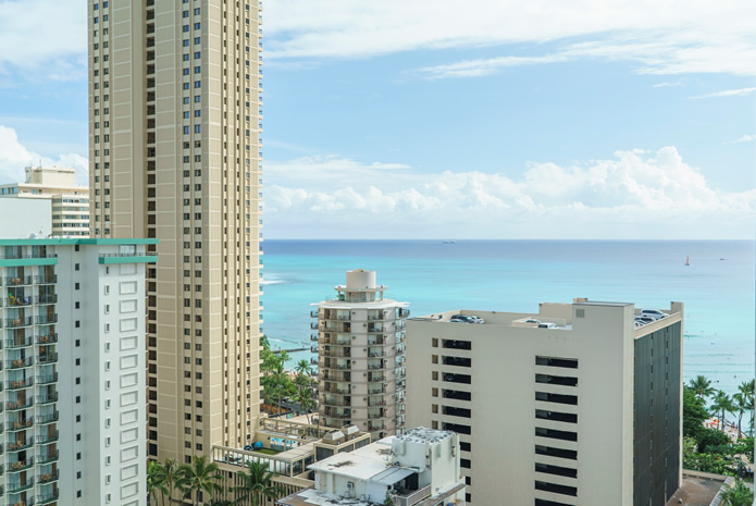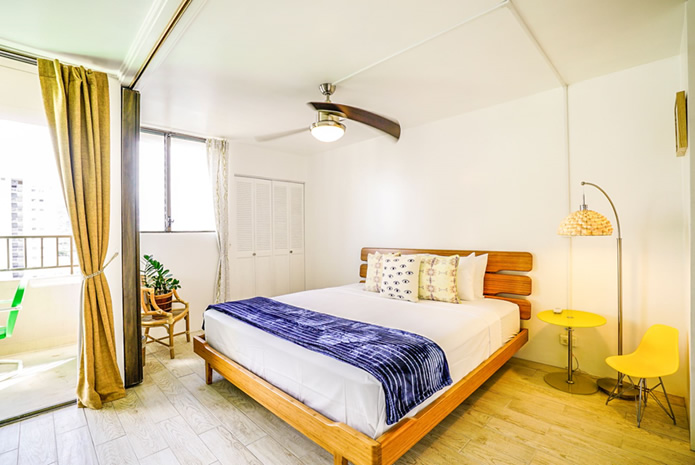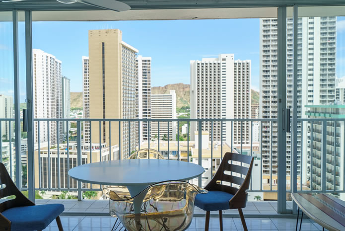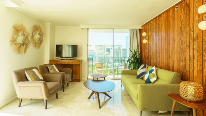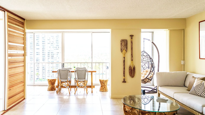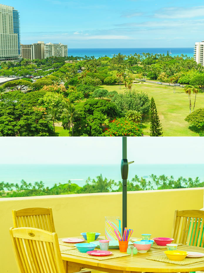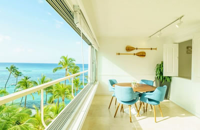 - 海とダイヤモンドヘッドの景色は今も変わらない。購入当時はコロニーサーフはそれほど有名でもなく売りがあった。この部屋をみた瞬間、改装すれば思い通りの部屋になると直感し、提案。